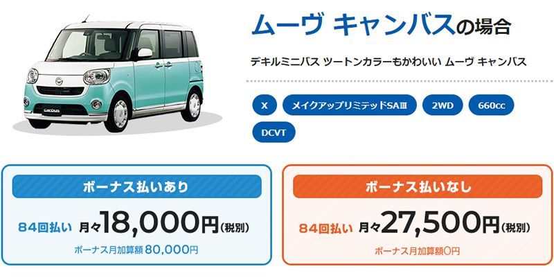 "ラクのり"は、頭金なしの月々1~3万円で新車に乗ることができます。例えば、DAIHATSUの人気車種の"ムーヴ キャンバス"が、最も安いプランでなんと月額18,000円!レンタカーを一日借りた程度の金額で乗ることができるんです。