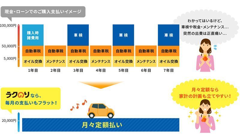 加えて、車税・車検費用・自賠責保険料・新車登録手数料・メンテナンス費用などの諸費用は、リース代金に全部含まれています。「車検費用・メンテナンス費用は別」というカーリース会社もありますが、"ラクのり"は、すべて込み!その上、定額制なので車検などの急な出費がなく、安心です。家計の圧迫を心配する必要も、車を所有した場合の面倒な手続きも必要ありません。
