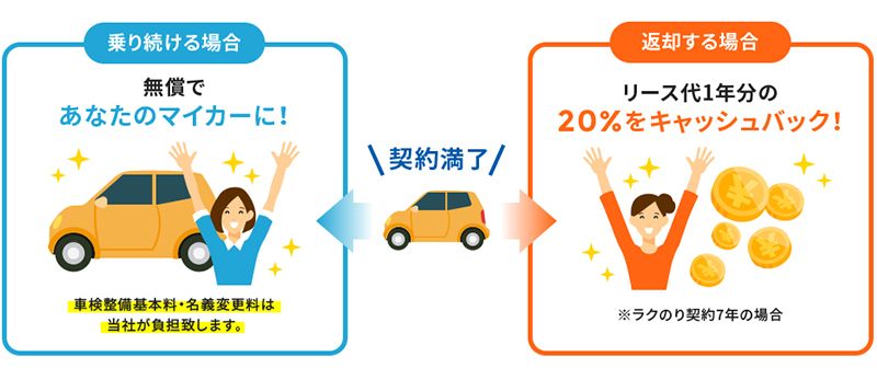 その点、"ラクのり"なら安心です。返却時の追加料金なし!それどころか、無料でマイカーにすることができます!また、新車に切り替えたい場合は返却する事も可能。さらに、リース代1年分の20%がキャッシュバックされます。