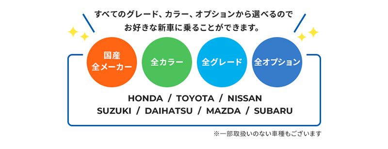 ほとんどのカーリースは、決められた車種から選ばなければいけません。しかし、"ラクのり"は、利用者が希望する新車をIDEX(イデックス)が代わりに購入してリースするため、全国内自動車メーカーの全車種から車を選ぶことができます。