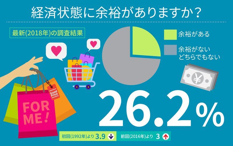 博報堂生活総合研究所「生活定点」の調査によると、生活気流について「経済状態に余裕がありますか?」という質問に「余裕がある」と答えた人の割合は26.2%でした。また、前回の2016年に対して+3%増加しています。