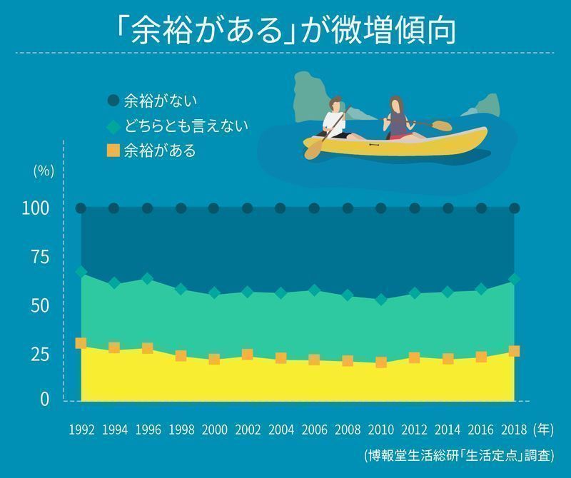 「余裕がある」と答えた人の割合は、2010年に過去最低の20.2%を記録して以降は微増傾向にあります。「余裕がない」と答えた人の割合は1998年に4割を超え、その後も40%台で推移していましたが、今回は36.7%と4割を下回りました。
