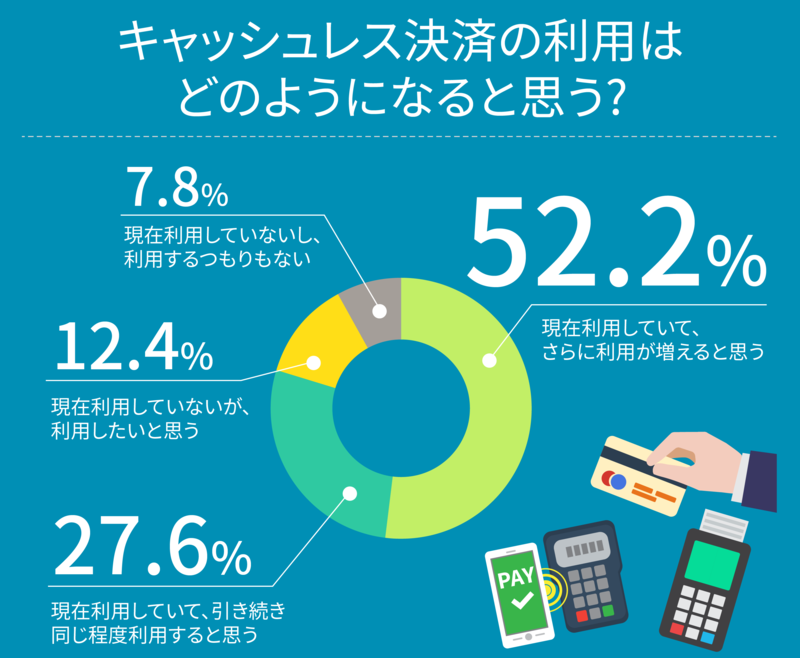 10月からの「ポイント還元制度」に伴い、キャッシュレス決済の利用はどのようになると思うかを聞いたところ、「現在利用していて、さらに利用が増えると思う」(52.2%)と回答した人が最も多く、「現在利用していないが、利用したいと思う」(12.4%)と回答した人を合わせると64.6%となり、前向きに捉える人が6割超になりました。