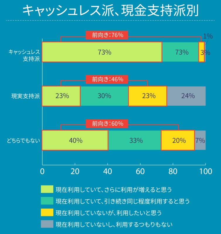 元々「キャッシュレス支持派」か「現金支持派」かで動向の差を見ると、「現金支持派」と「どちらでもない派」でも、「利用増+利用したい(「現在利用していて、さらに利用が増えると思う」と「現在利用していないが、利用したいと思う」)の合計」は現金支持派:46%、どちらでもない派:60%となり、高い利用意向が伺えました。「ポイント還元制度」の後押しもあり、利用に慎重派であった層にも普及が進む可能性がうかがえました。