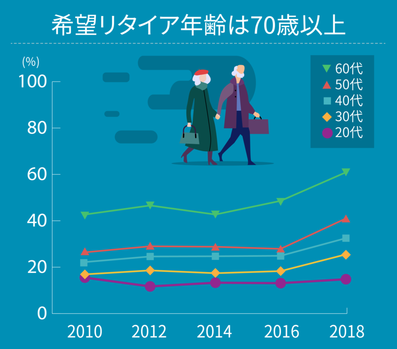 調査を開始した2010年当初と比べると、「希望リタイア年齢は70歳以上」と答えた人の割合は全体的に増加しています。年代別に見ると、60代が60.9%で全体より約26ポイント高く、逆に20代は、全体より約20ポイント低い14.8%でした。