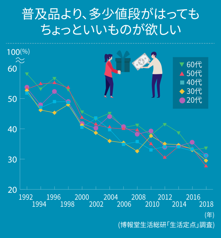 調査を開始した1992年当初と比べると、「普及品より、多少値段がはってもちょっといいものが欲しい」と考えている人の割合は全体的に減少しており、過去最低の数値となりました。