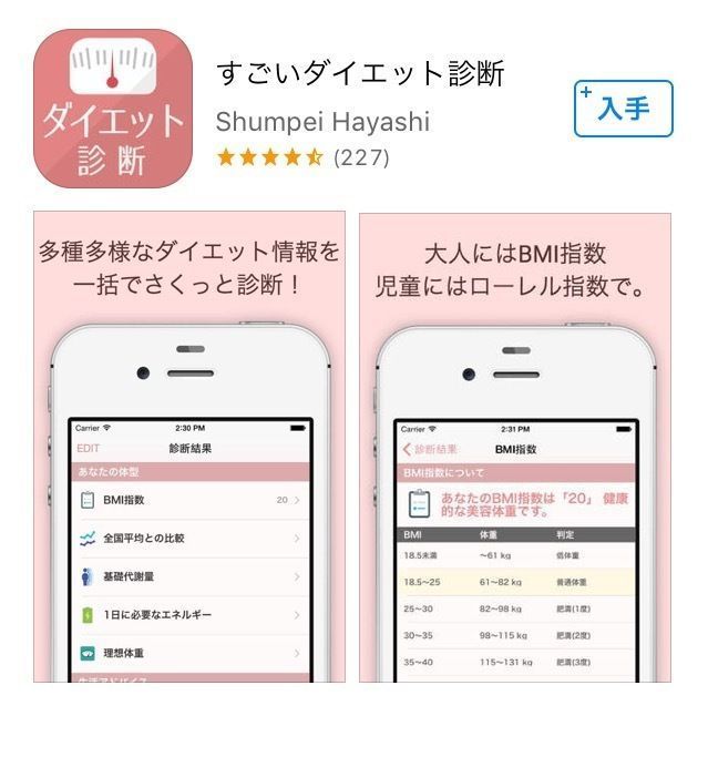 ヒントになるのは「ダイエット診断」(無料)というアプリです。体型やいつもの過ごし方、好きな食事、性格など様々な項目を入力すると、生活・食事・運動のアドバイスをしてくれます。ちなみに私の場合、食事アドバイスに“低炭水化物ダイエット”“が出てきたので、自分の判断もまんざら間違っていないと思いました。