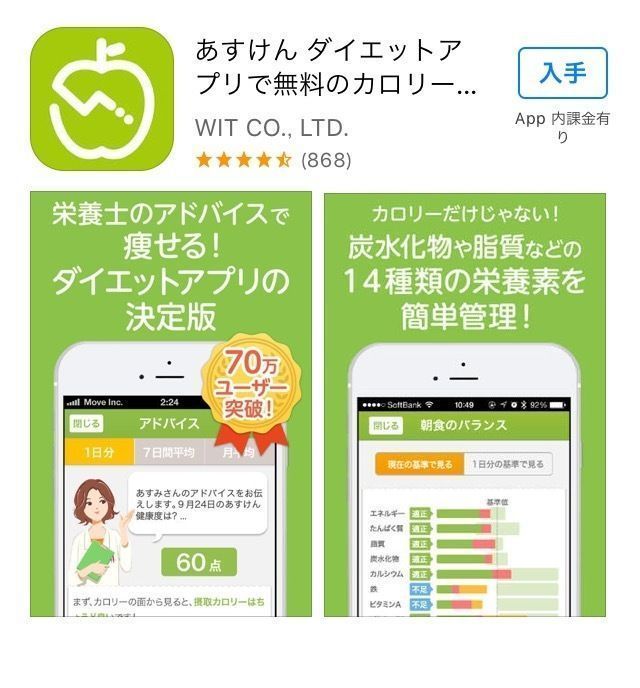 A2 「あすけん」(無料)というアプリが抜群にすごいです!実際にどんな条件で検索しても出てきて、ユーザー数、レビュー数ともにかなり多い人気のアプリ。簡単な食事記録をするだけでカロリーの計算、体重管理ができます。理想的な栄養素の基準値に比べて、何が過剰・適正・不足しているかがグラフで出て、とてもわかりやすいです。