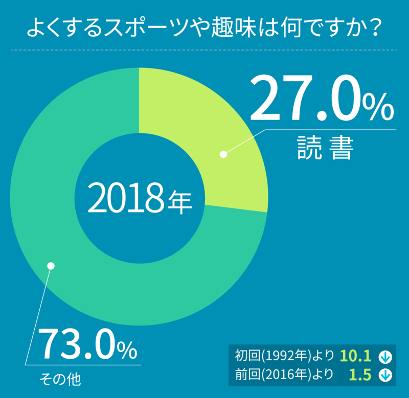 調査を開始した1992年当初と比べると、「よくするスポーツや趣味は読書である」と答えた人の割合は減っており、全体平均で過去最低の数値となりました。