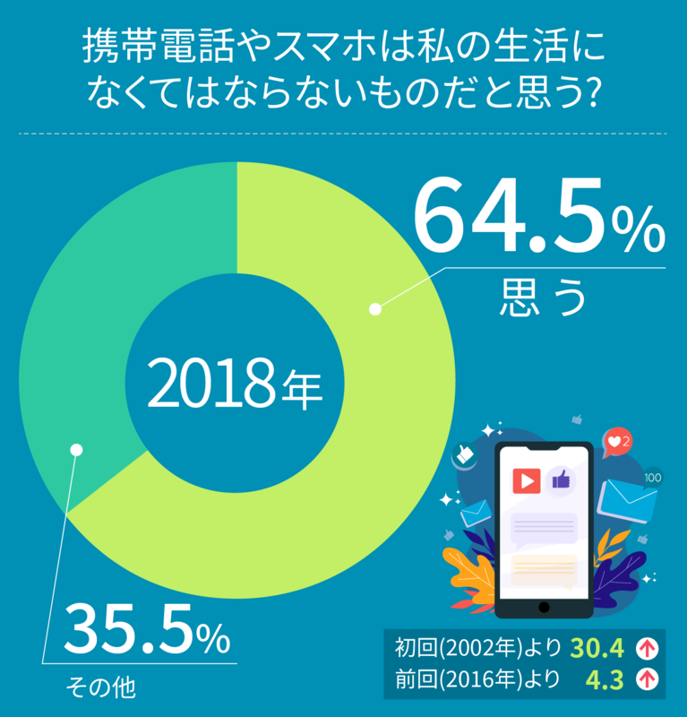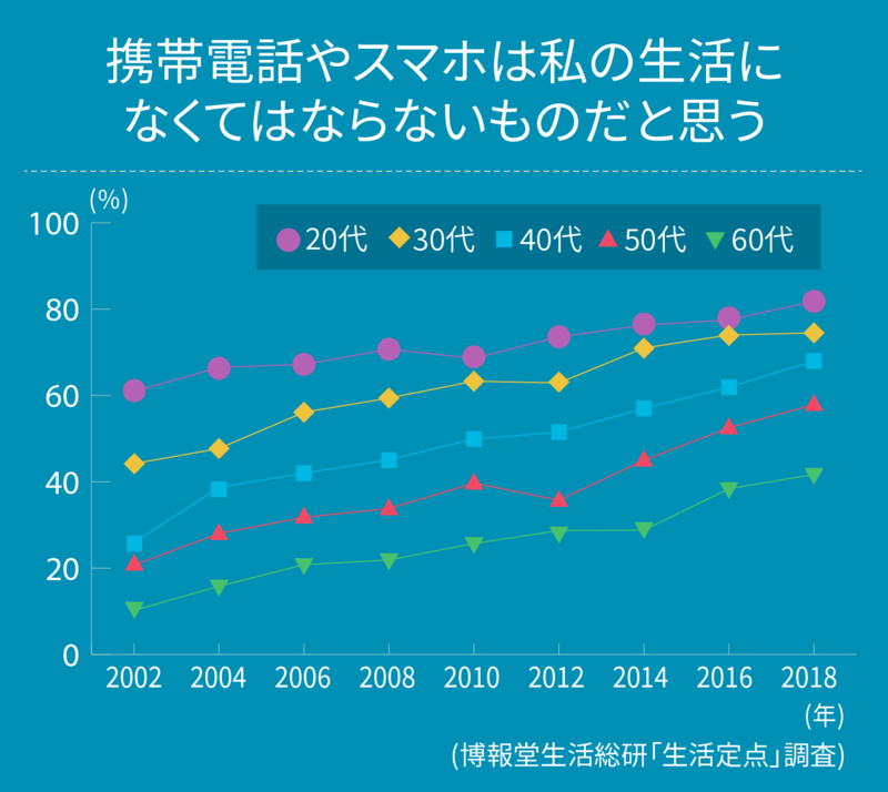 調査を開始した2002年当初と比べると、、「携帯電話やスマホは生活になくてはならないと思う」と答えた人の割合は増えており、全体平均で過去最高の数値となりました。
