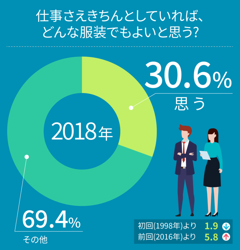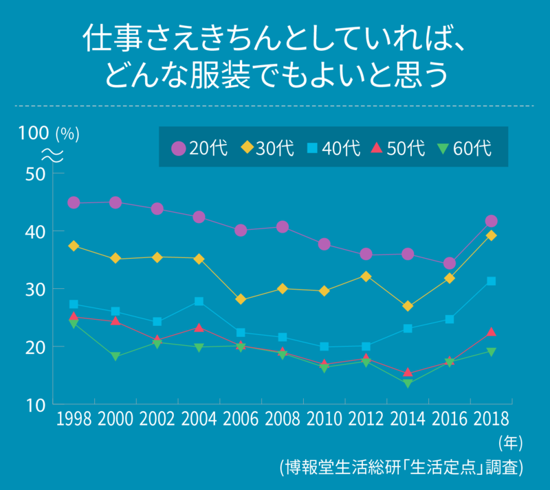 調査を開始した1998年当初と比べると、「仕事さえきちんとしていれば、どんな服装でもよいと思う」と答えた人の割合は全体平均で増加しています。