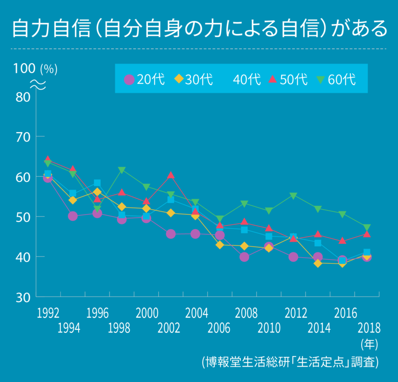 調査を開始した1992年当初と比べると、「自力自信(自分自身の力による自信)がある」と答えた人の割合は全体的に下り調子です。