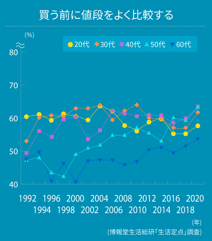 「買う前に値段をよく比較する」と答えた人の割合は、調査を開始した1992年当初から増加し、全体平均で過去最高の数値となっています。年代別に見ると、60代が53.8%で全体より約6ポイント低く、逆に40代は、全体より約3ポイント高い63.3%という結果でした。