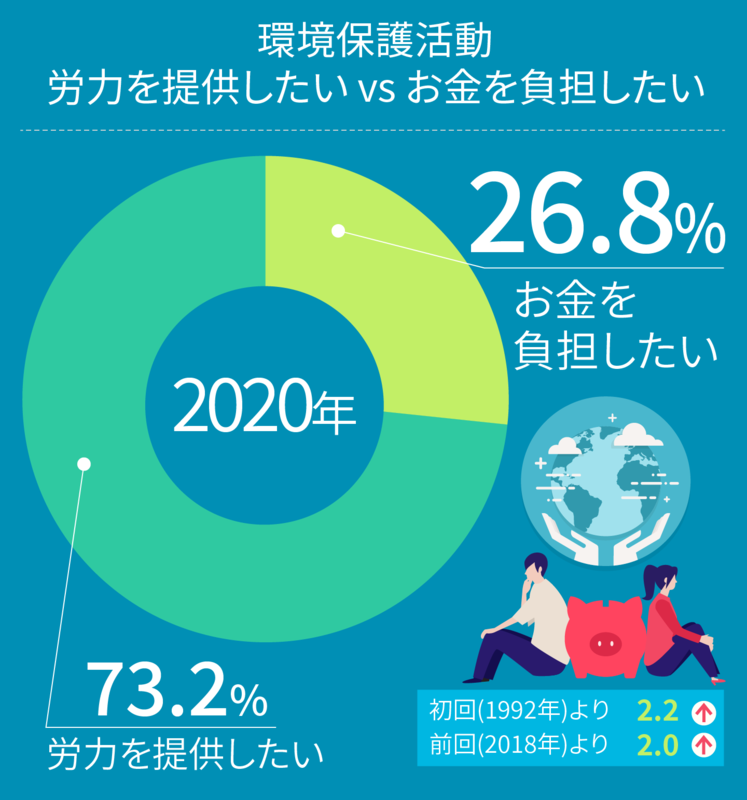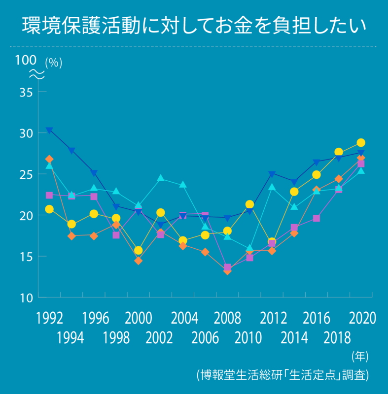 「環境保護活動、お金を負担したい」と答えた人の割合は、調査を開始した1992年当初から全体平均で増加し過去最高の数値となっています。