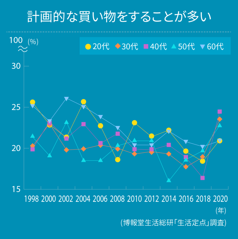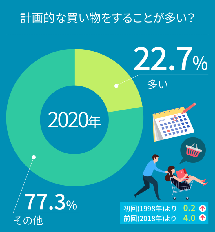 「計画的な買い物をすることが多い」と答えた人の割合は調査を開始した1998年から低めで推移していますが、2020年の調査では全体平均で過去最高の数値となりました。