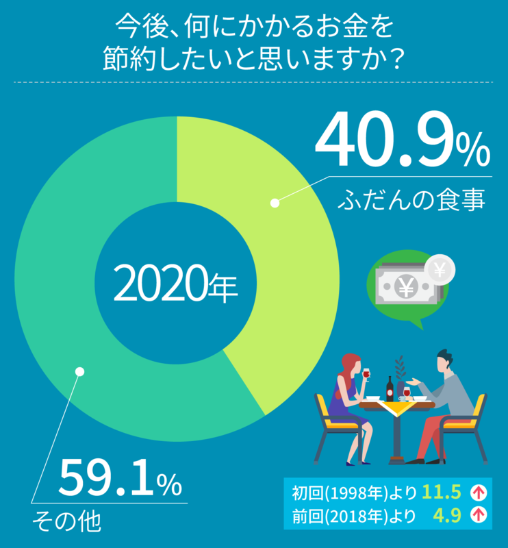 「今後、何にかかるお金を節約したいと思いますか?」という質問に「ふだんの食事」と答えた人の割合は40.9%でした。