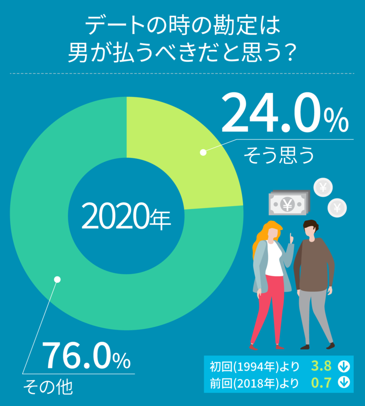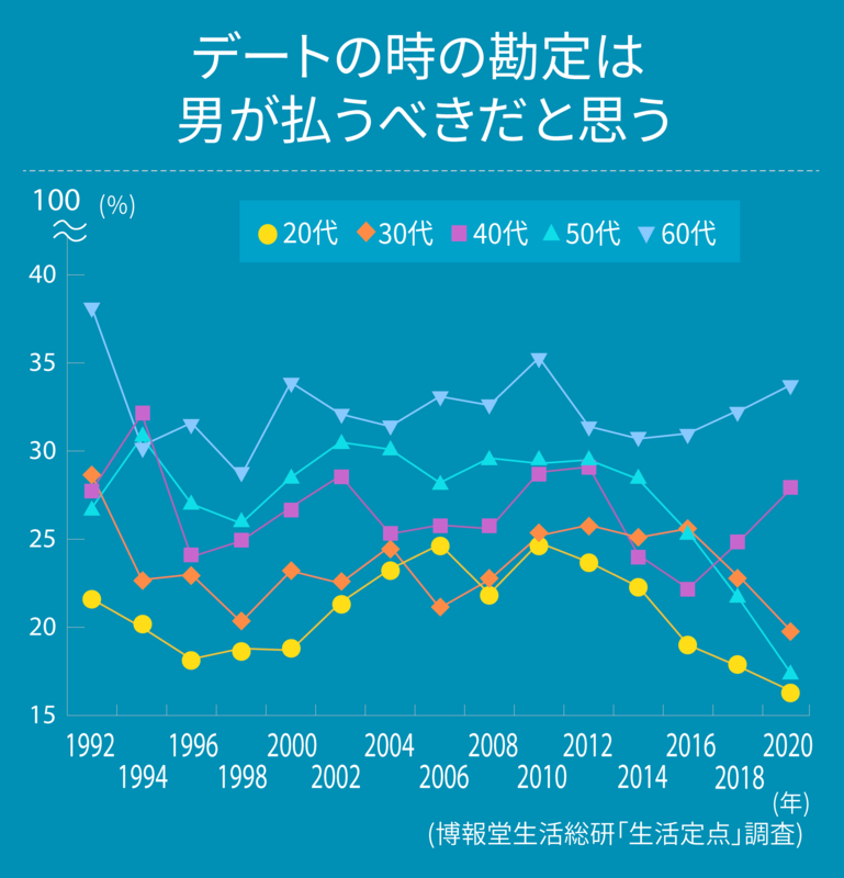 【博報堂生活総合研究所「生活定点」調査】のデータにおいて、「デートの時の勘定は男が払うべきだと思う」という人はどれくらいいるのでしょうか。