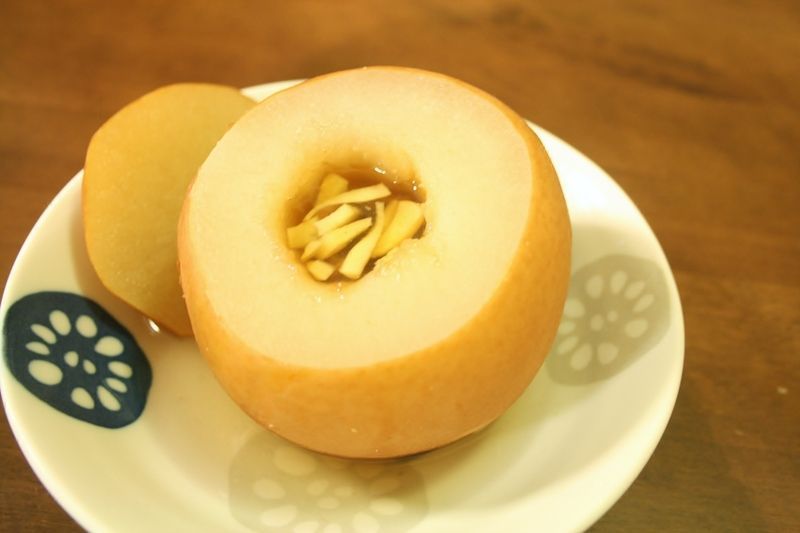 漢方にあるレシピです。梨に火を通すと、咳や肺の病気に効くと言われています。好みでクコの実などを加えてもOK。
