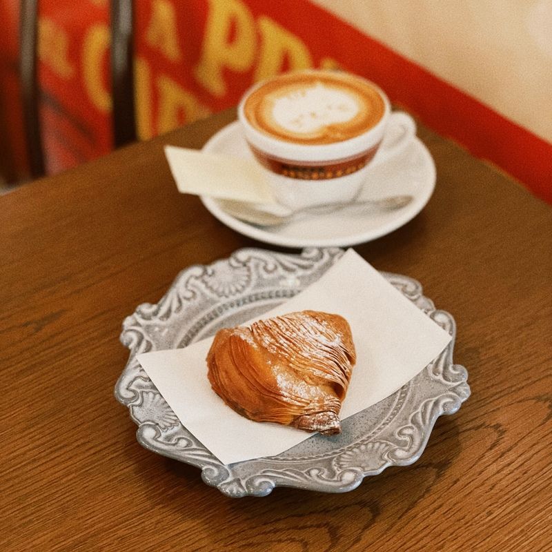 貝殻のような不思議なモチーフをしたこのパイは、17世紀から伝わるイタリアの郷土菓子「スフォリアテッラ」。パイ生地を何層にも重ね、生地の中にクリームを入れてオーブンで焼き上げたナポリ地方名物の焼き菓子です。『カフェ オスピターレ』では日本人の好みに合わせてクリームチーズやシナモン、オレンジを入れ、カリッ!パリッ!の生地の食感を引き出すために低温でじっくり焼き上げています。こっくり甘いスフォリアテッラと、ほろ苦のカプチーノ(470円、税込)が最高にマッチ! 福岡にいながら束の間のイタリア気分を楽しめますよ♪