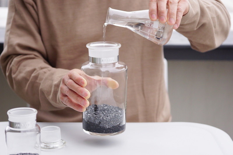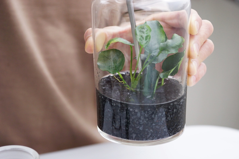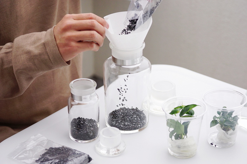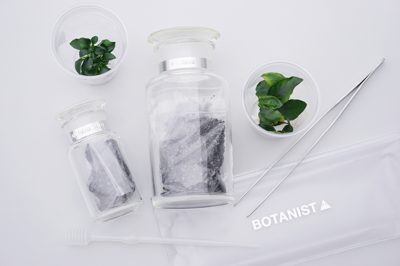 キットに含まれるのは、試薬瓶と植物、黒い砂利、そしてピンセット&スポイトのツールセット。自分で瓶に植えていくのですが、これがちょっと実験気分で楽しい。