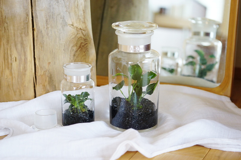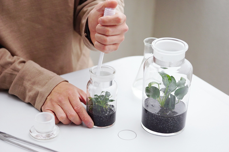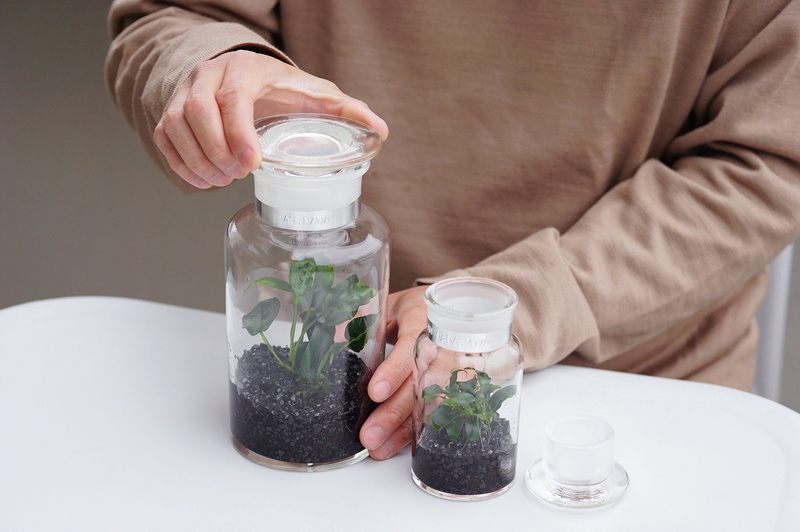 必要なのは15~30°Cに保たれた環境と室内の明かりだけ(直射日光はNG)。あとは、植物の酸欠予防のために月に1度、瓶の栓を数秒あけて空気の入れ替えを行うこと。ホント手間いらずで楽チン。