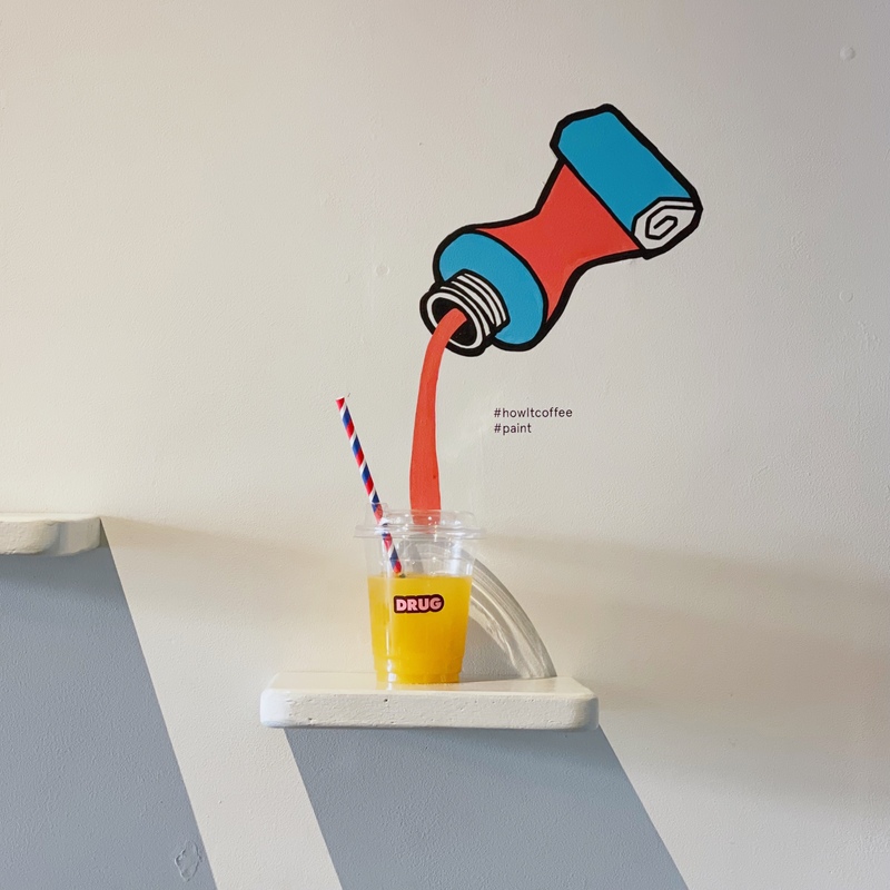 大名小学校跡地のスタートアップ支援施設『Fukuoka Grown Next』の1階に店舗を構える『Howlt coffee(ホルトコーヒー)』。ここは〈ナイキ〉や〈WWF〉、〈スミノフ〉などのアートワークを手掛けるアートブランド〈Howlt(ホルト)〉が運営するカフェです。アート&カラーがテーマとあって、店内のいたるところにカラフルなアートが施されていたり、フォトスポットが用意されていたりと仕掛けがいっぱい! こんな風に「オーガニックオレンジジュース」を使って、“赤いペンキが黄色の液体に変化した図”の撮影も楽しめます。