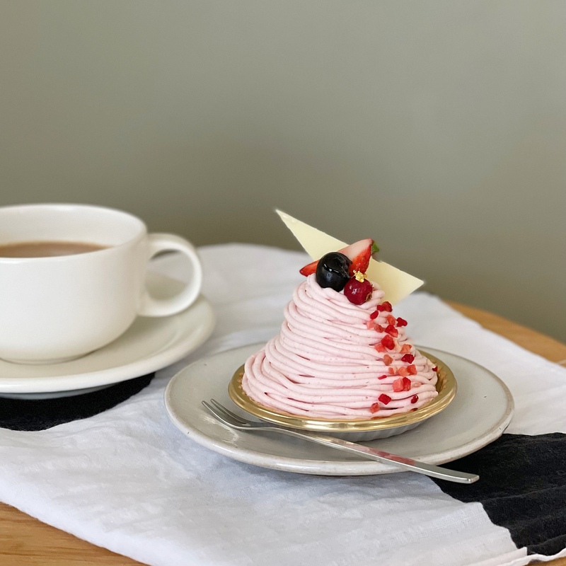 『西鉄グランドホテル』1階にあるベーカリー&スウィーツショップ『LE PETIT PALAIS(ル プティパレ)』。宝石のようにキラキラとオーラを放つ洋菓子は、創業当時から人気の「苺のショートケーキ」(529円、税込)や、クロワッサン生地にクレームブリュレをサンドした「クブレ」(270円、税込)など色とりどりのラインアップ。今回はワンコインで楽しめる期間限定メニューの「苺モンブラン」をセレクト! 甘酸っぱい苺クリームの中にピスタチオとホワイトチョコのムースが入っていて、春のそよ風のように柔らかくて爽やかな味わいです。