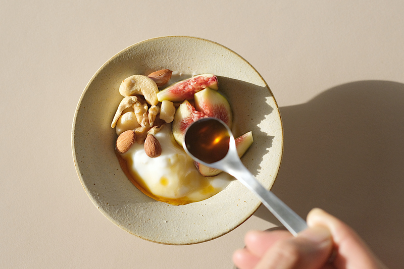 置いておくだけで絵になるので、テーブルに常時スタンバイ! 表に出したくないボトルデザインだと棚に入れっぱなしになって、ズボラな僕の場合はついつい存在を忘れてしまうので、目に見える場所に置いておけるデザインというのも“はちみつ習慣”を続けられるポイントかなと思います。
