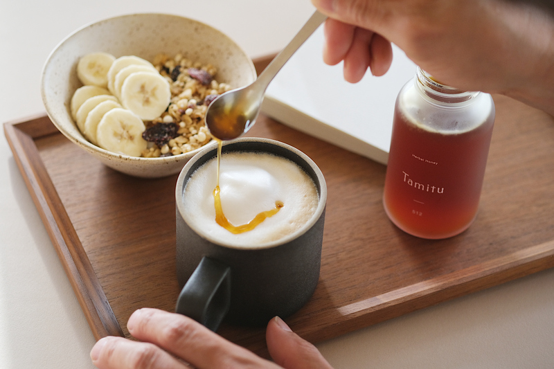 従来のはちみつは時間が経つと固まるものが多く、どろっとしていて水に溶けにくい性質を持っていますが、〈Tamitu〉は固まらず、水にも溶けやすいのが特徴的。さらっとしたシロップのような口当たりなので、かけたり、まぜたり、そのまま口に含んだりと、いろんな使い方ができて取り入れやすいんですよ。