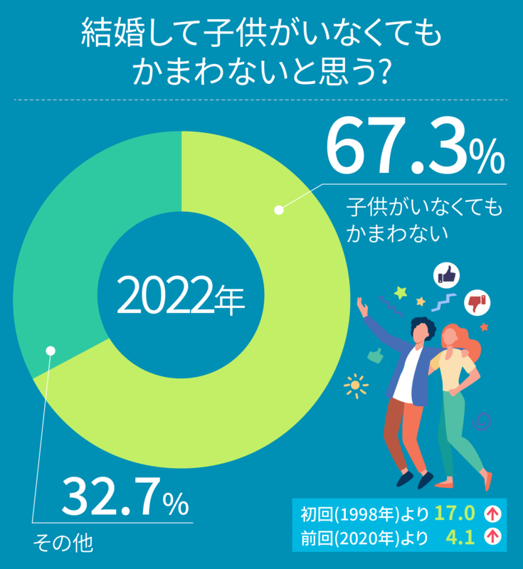 「恋愛・結婚について、あなたにあてはまるものを教えてください。」という質問に「結婚して子供がいなくてもかまわないと思う」と答えた人の割合は67.3%と、前回より約4ポイント上昇しました。