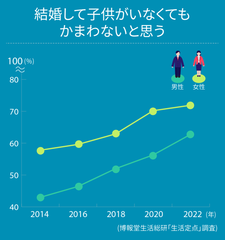 「結婚して子供がいなくてもかまわないと思う」と答えた人の割合を男女別に見ると、女性が71.9%で男性よりも約9ポイント高い結果となりました。男女ともに過去最高を記録し、その割合は年々増加していることが伺えます。