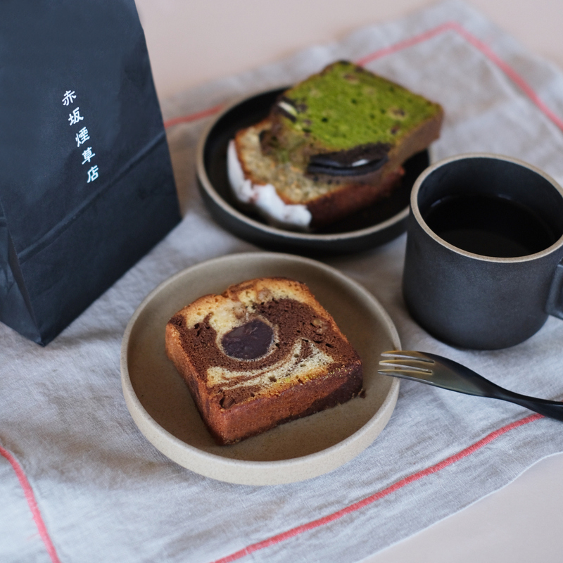 赤坂2丁目のバス停前にひっそりと佇む、テイクアウト専門の焼き菓子店『赤坂煙草店』。昔ながらのタバコ屋をそのまま活かした店構えが印象的で、レトロな看板やショーケースがいい味を醸し出しています。また「営業は水・木曜のみ」というレア感も好奇心をそそるポイントで、人気のあまり、昼過ぎには全品完売となることも! 店頭には素材の組み合わせが面白いパウンドケーキが約8種類並び、どれにしようか迷ってしまうラインアップ。「モカと餡子と胡桃のマーブルケーキ」は、こし餡の上品な甘味とコーヒーの風味がベストマッチ! その他、「抹茶とオレオのケーキ」(450円、税込)や「レモンとブルーポピーシード」(400円、税込)も人気のようです♪