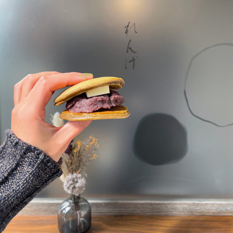 ビルのエントランスにひっそりと佇む、テイアウト専門のどら焼き店『れんげ』。こちらは赤坂の人気たい焼き店『博多ひいらぎ』の姉妹店で、本店でも好評の自家製あんこをどら焼きに使用し、それが絶品だと甘党の間で話題沸騰! メニューはプレーンの「どらやき」(250円、税込)、バターを挟んだ「バターどらやき」、季節限定の「ほうじ茶クリームどらやき」(350円、税込)、そしてあんこ×梅の「餡梅大福」(2個入り560円、税込)という少数精鋭のラインアップ。北海道産小豆・粗糖・塩のみで作られる評判の粒あんがおいしくて、バターとのハーモニーも最高です!