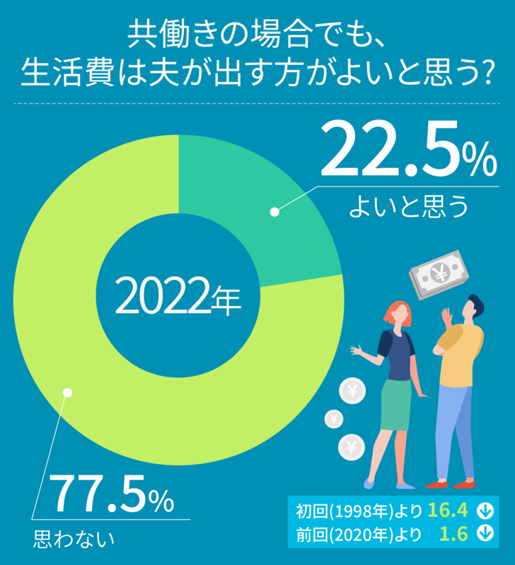 「家族について、あなたにあてはまるものを教えてください。」という質問に、「共働きの場合でも、生活費は夫が出す方がよいと思う」と答えた人の割合は22.5%。過去最低の割合となりました。