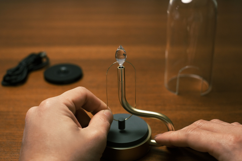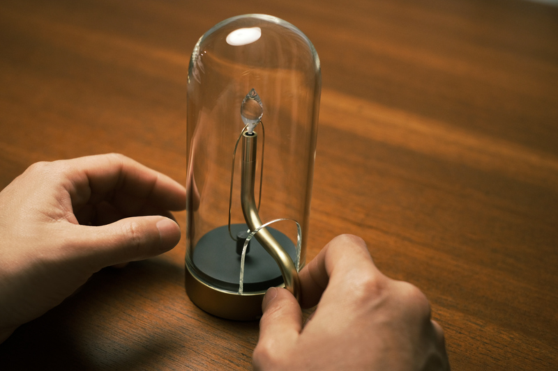 とはいえ、セッティングは簡単。持ち手が付いた燭台風のベースを軸にして、持ち手先端の凹み部分に「ペンデュラムレンズ」というアクリル樹脂のランプをやさしく乗せます。