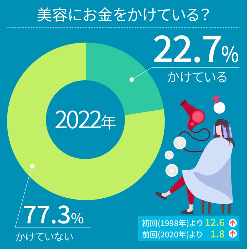 「現在、何にお金をかけていますか?」という質問に、「美容にお金をかけている」と答えた人の割合は22.7%。数値としては高くないものの、調査開始以来最も高い割合となりました。