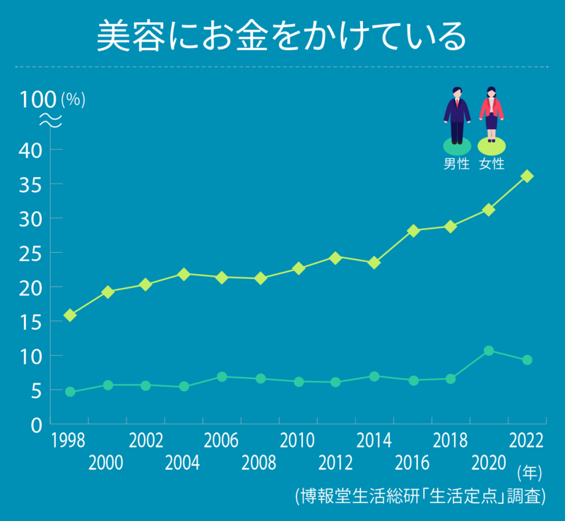「美容にお金をかけている」と答えた人の全体の割合は前回からほぼ変化がないものの、男女で違いがあるようです。男女別に見ると、女性が36.2%、男性が9.3%と、女性の方が約27ポイント高い結果となりました。また男女差はしだいに大きくなっていることが伺えますね。