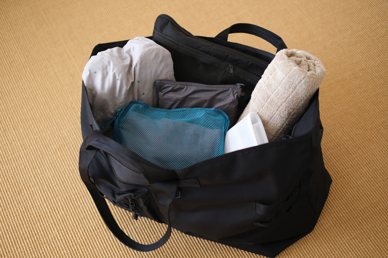 約65リットルの大容量なので、冬場は2~3泊分、夏場なら4泊~1週間分の衣類を収納できる大きさ。写真の荷物の量でもバッグの容量に対して半分くらいで、