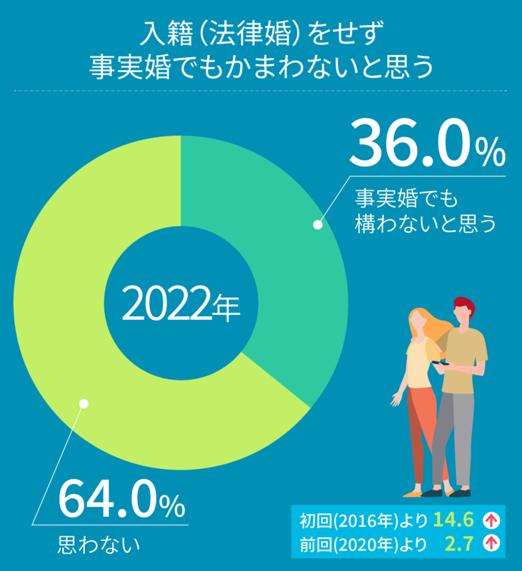 2022年の調査で「恋愛・結婚について、あなたにあてはまるものを教えてください。」という質問に、「入籍(法律婚)をせず事実婚でもかまわないと思う」と答えた人の割合は36.0%。少数派ではあるものの、前回より2.7ポイント上昇し、過去最高の割合となりました。