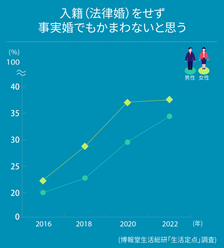 「入籍(法律婚)をせず事実婚でもかまわないと思う」と答えた人を男女別に見ると、2022年は女性の方が約3ポイント高い結果となりました。男女ともに増加傾向にあるようです。