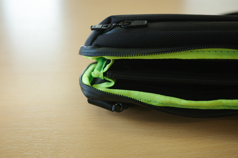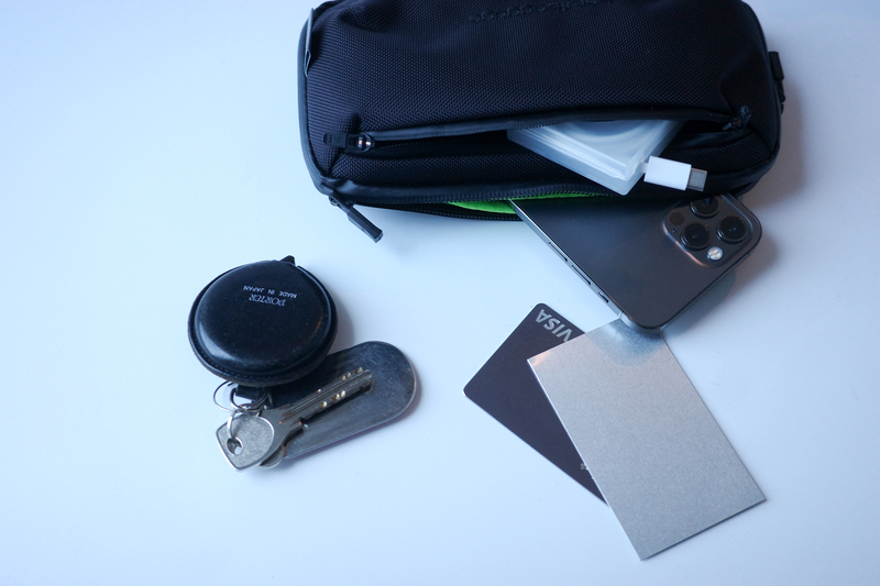 まずはやっぱりサイズと仕様。上部に2つ口がある仕様なんですが、前面のポケットにはイヤホン、充電ケーブルなどのガジェットにキーホルダーやリップなどの日用小物がすっぽり収納。(近所の散歩とかだったらミニマルな財布だけでいいものの、休日のお出かけなんかだと心許ないことありますよね)