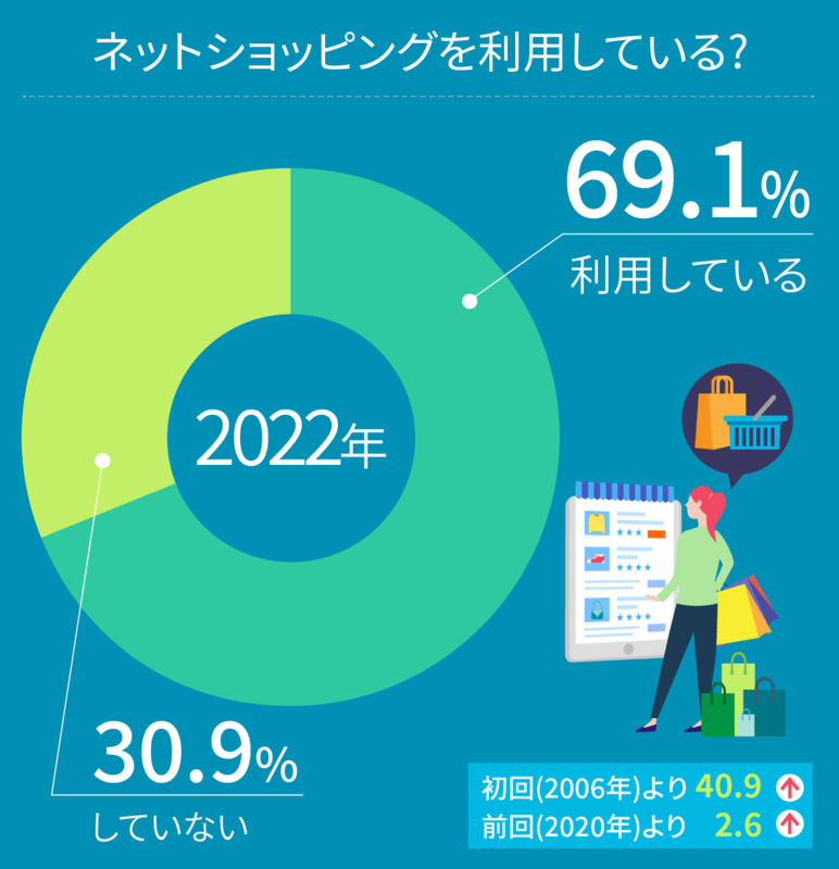 2022年の調査で「ネットショッピングを利用していますか?」という質問に、「利用している」と答えた人の割合は69.1%。前回の調査からほぼ変化はないものの初回調査から4割ほど増加しています。