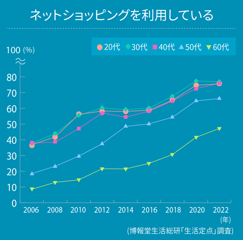 「ネットショッピングを利用している」と答えた人の割合は年々増加傾向にあり、2022年は過去最高を記録。年代別に見ると30代が77.0%と全体より約8ポイント高く、逆に60代は全体より約22ポイント低い47.2%という結果となりました。
