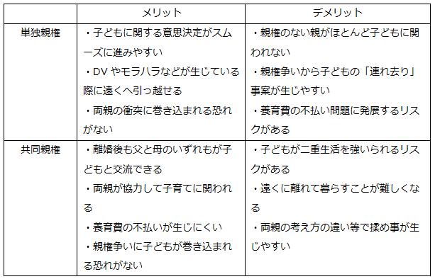 共同親権になると、離婚後も子どもの養育に関して父母のやりとりが必要となる場面が多く、父母の関係性によっては単独親権が好ましい場合もあるでしょう。