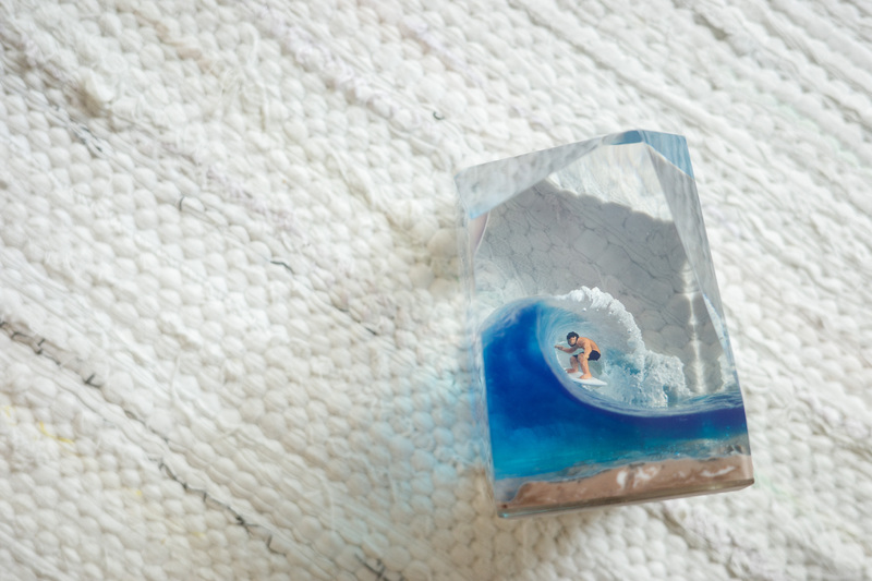 クリスタルキューブの中には、「サーファーとサーフボードそして波が一体となる瞬間が切り取られ、ブレイクする波、多彩なボード、それぞれのサーファーの精神がスタイルとなり波の上で奏でるダンスとして表現されている」とのことで、チャーミングながら刹那な叙情性も兼ね備えているこちらの作品。