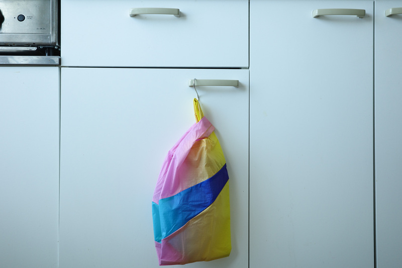 クラシカルなビニール袋の形に、サイドの折り目が深く入った機能的なショッピングバッグとして、使い捨てのビニール袋に代わるバッグを作り、そこから生まれるゴミを減らしたいという想いから誕生しました。