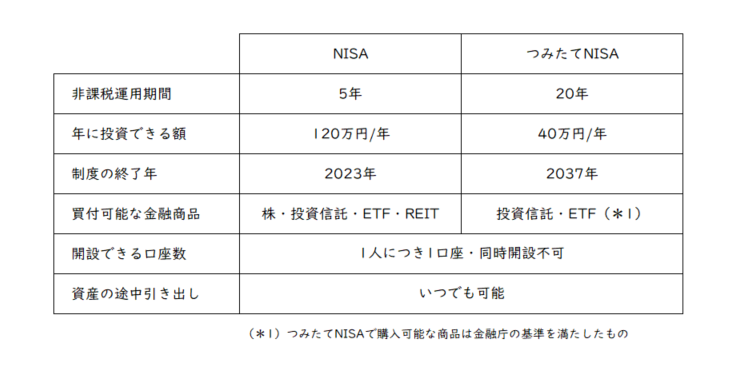 「NISA」は証券会社が取り扱っている商品の大部分が購入できます。それに対し「つみたてNISA」は金融庁の基準をクリアした投資信託とETF(上場投資信託)に限定をされており、株式の購入はできません。また各年度で「NISA」か「つみたてNISA」のどちらか一つしか利用できませんので注意が必要です。