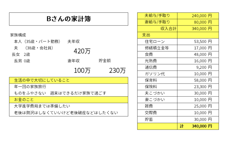 FP(ファイナンシャルプランナー)がお客さまの家計簿を診断し、ライフプランについてアドバイスさせていただく【うちのライフプラン】。今回のお客さまは「子供2人の子育て費用、住宅ローンのためにフルタイムで働いてほしい」と夫に言われた、パート主婦35歳のBさん。夫と子供2人の4人家族です。