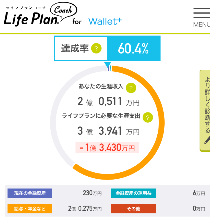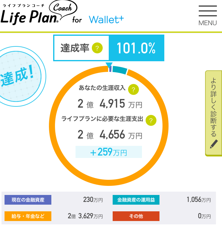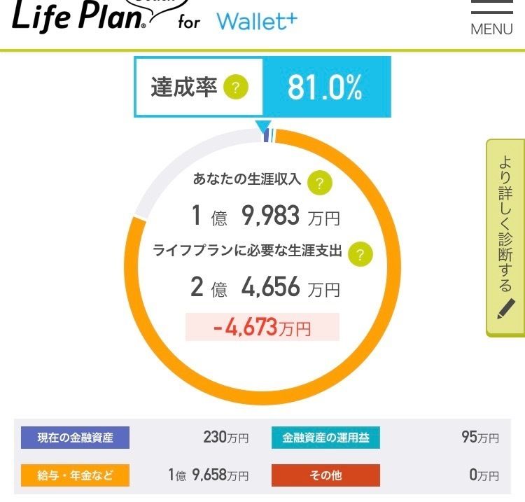 また生活費、車の購入費用、毎年の旅行費用など具体的に入力していくと、将来不安な支出が81%の達成率となりました。