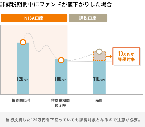 よって、課税口座に移し、110万円で売却した事例の場合、非課税期間終了時の100万円から値上がりした10万円が課税対象となるため、実際は利益が出ていないにも関わらず税負担が生じる可能性もあるわけです。こういったNISAの特性を踏まえて判断してください。